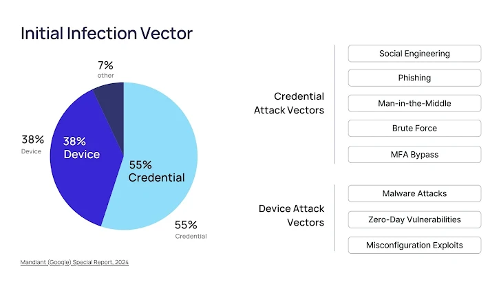 The problem is simple: all breaches start with initial access, and initial access comes down to two primary attack vectors – credentials and devices. This is not news; every report you can find on the threat landscape depicts the same picture.