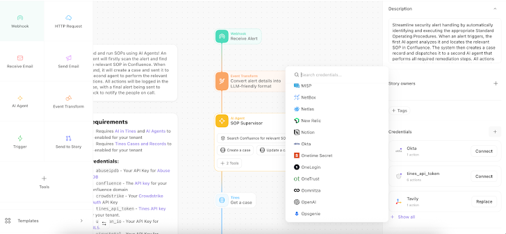 This prebuilt workflow automates the entire alert triage process by leveraging AI agents and Confluence SOPs. The workflow helps security teams respond faster and more consistently by: