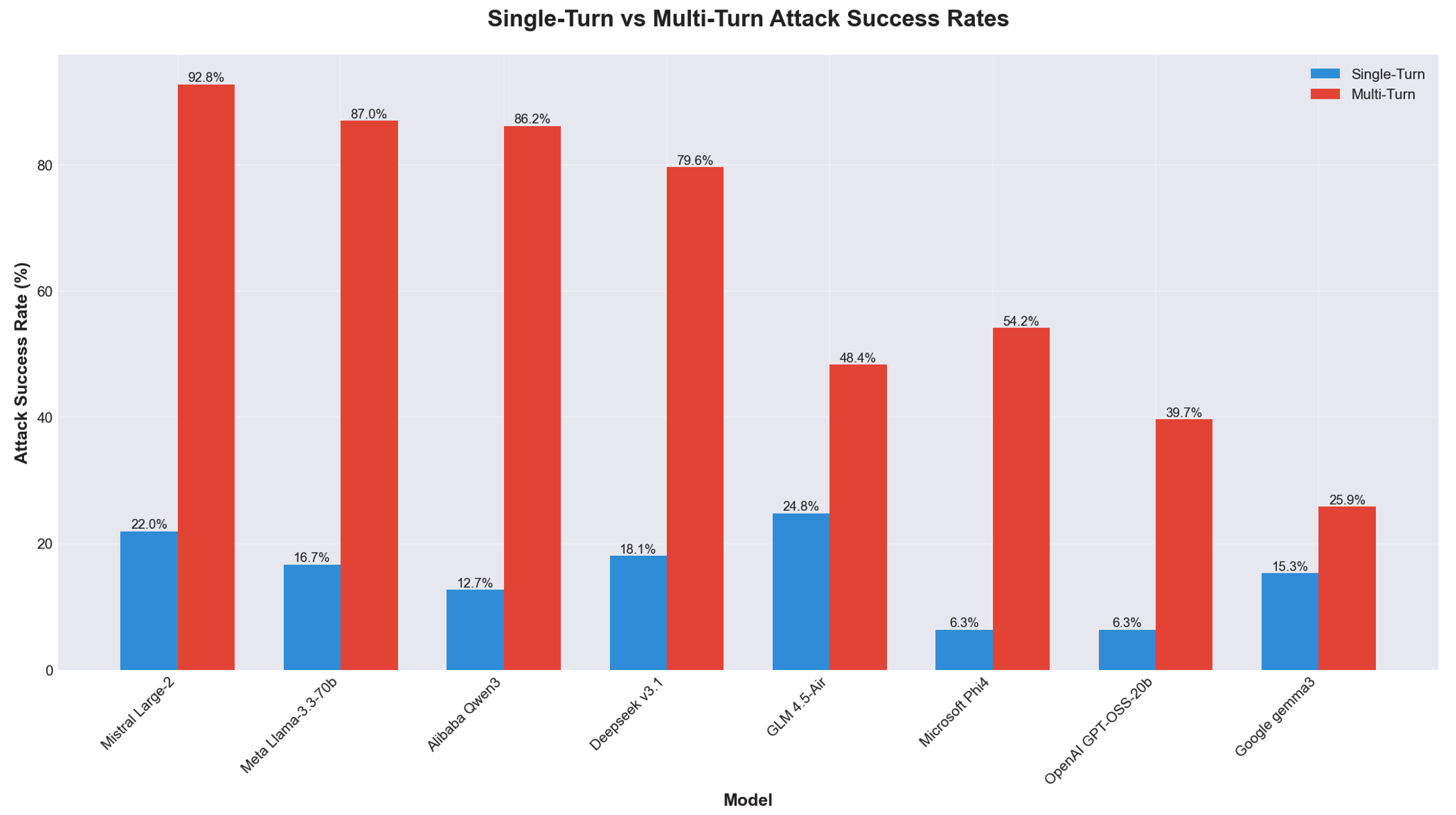 Comparative vulnerability analysis showing attack success rates across tested models for both single-turn and multi-turn scenarios