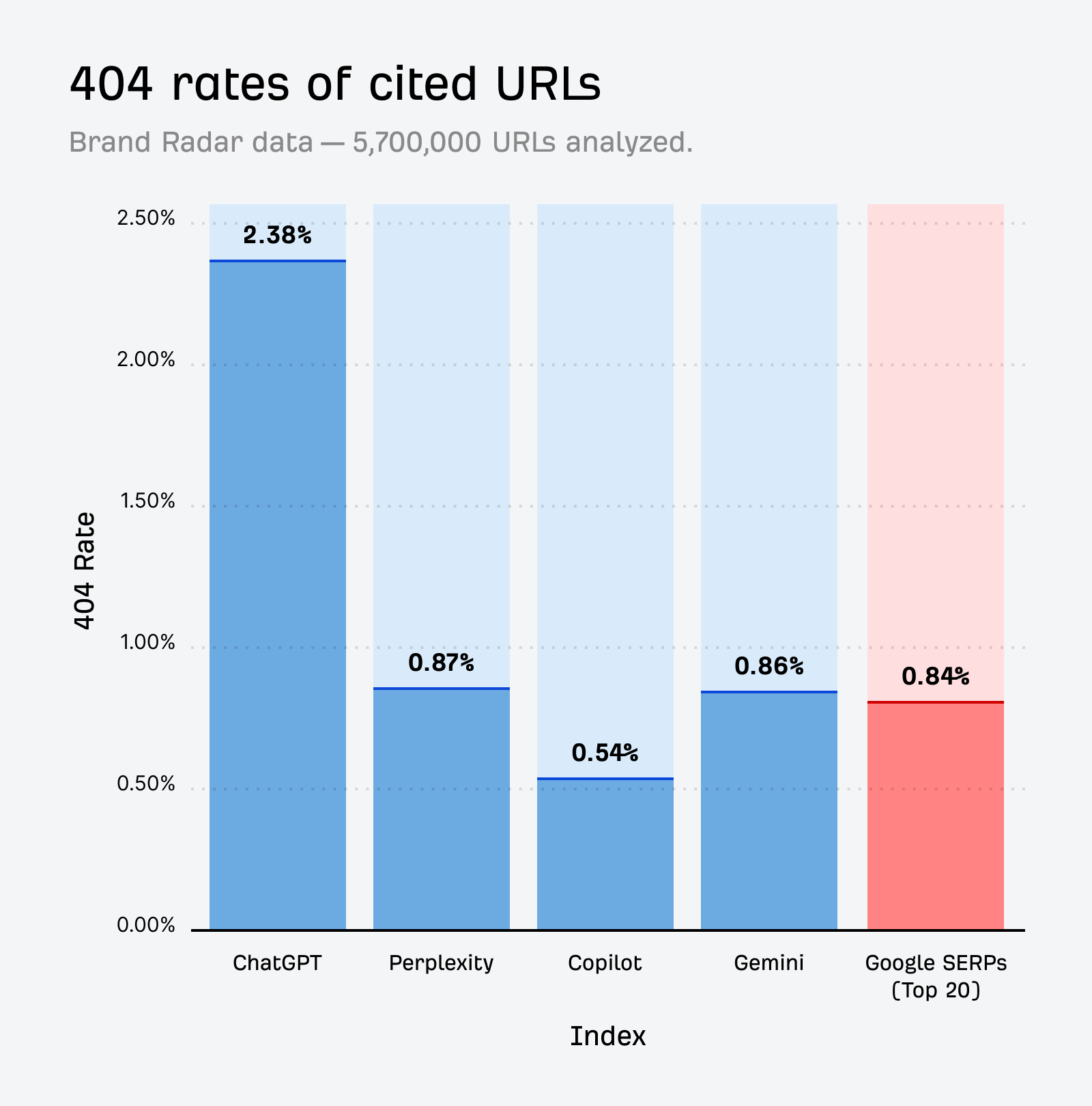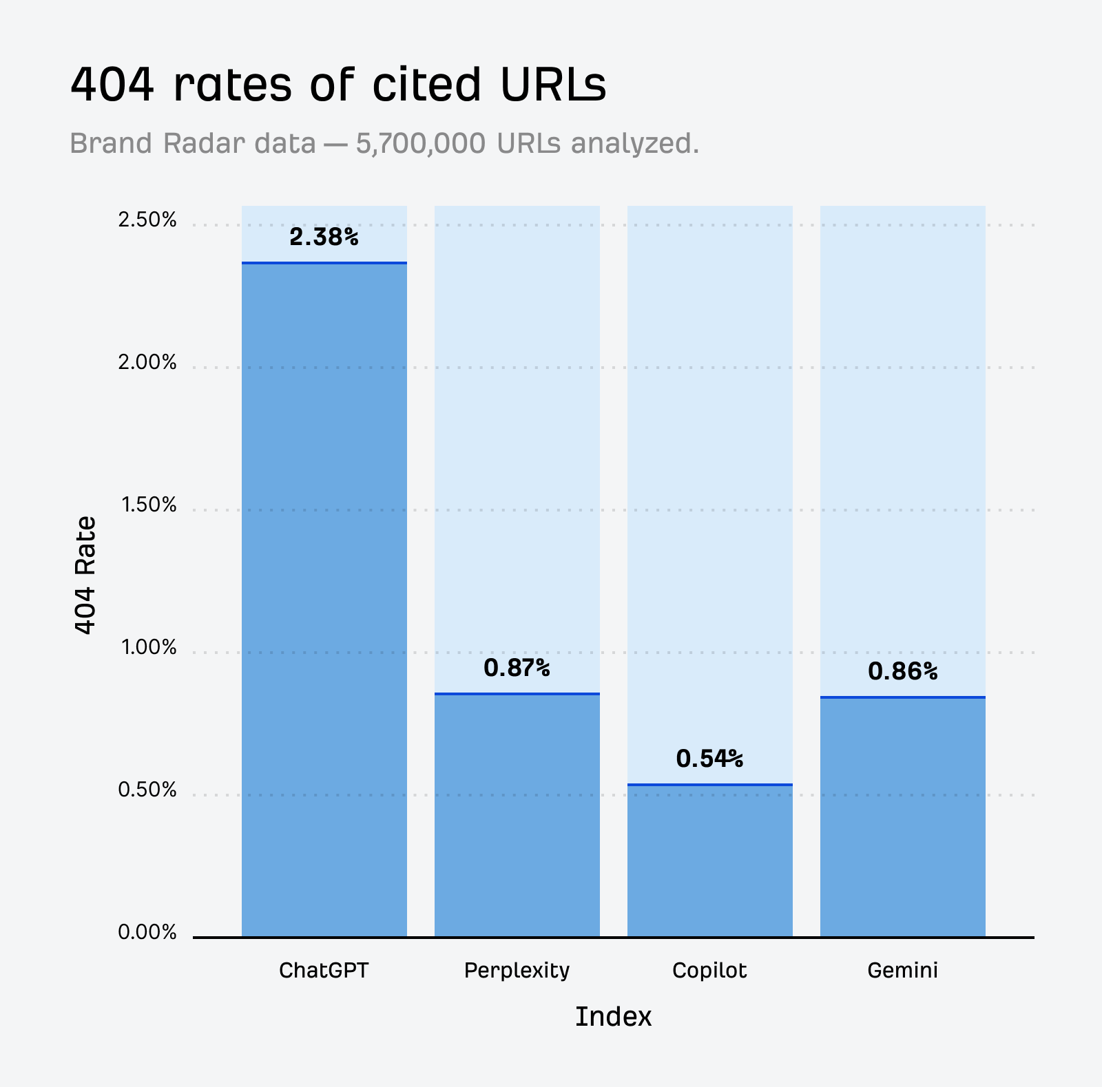 To find out, we looked at the http status of 16 million unique URLs cited by ChatGPT, Perplexity, Copilot, Gemini, Claude, and Mistral.
