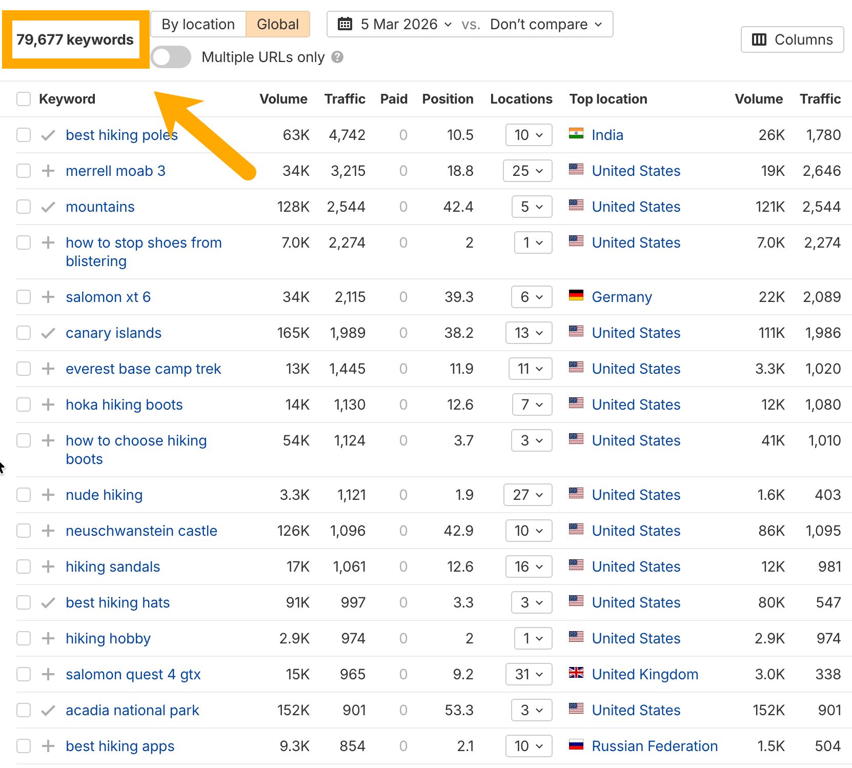 Let me give you a concrete example. When I analyzed /r/hiking in Site Explorer, I found it ranks for almost 80,000 keywords. That includes terms like “best hiking boots for beginners” (2,400 searches/month) and “what to bring on a day hike” (1,900 searches/month).