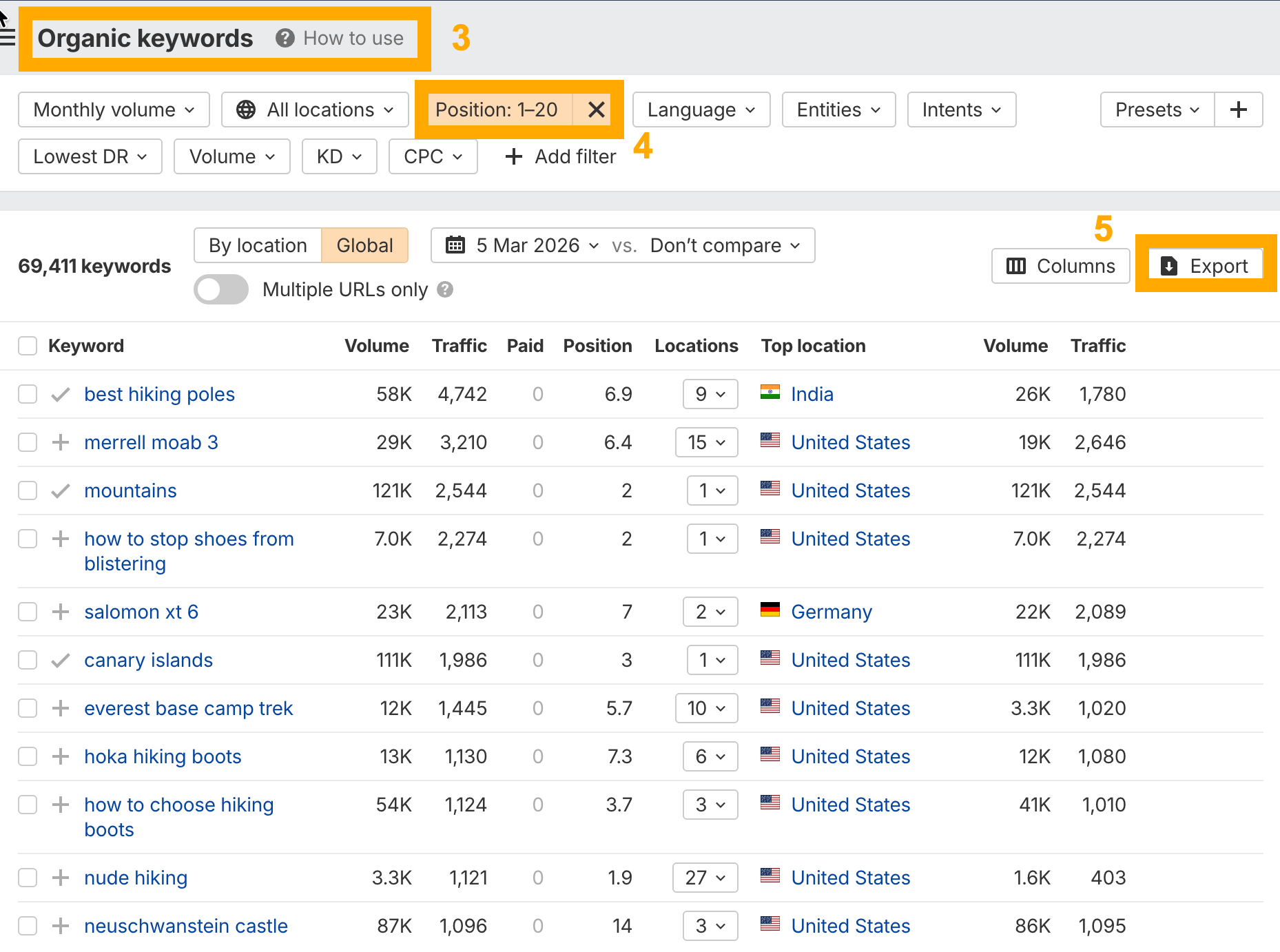 Site Explorer’s Organic keywords report for reddit.com/r/hiking, filtered to positions 1-20. Each keyword here is a proven content opportunity.