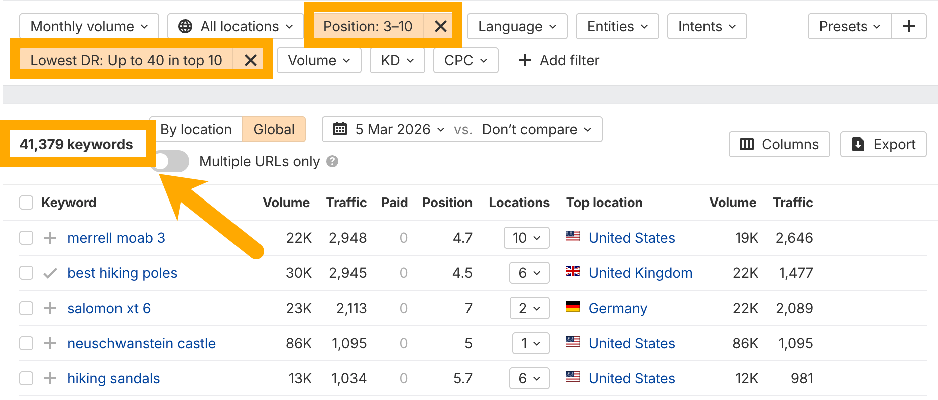 You can also combine filters. To make sure smaller, less authoriative websites can rank for each keyword, I like to filter to keywords that have at least one DR40 (or lower) website ranking in the top 10. Those are your best opportunities.