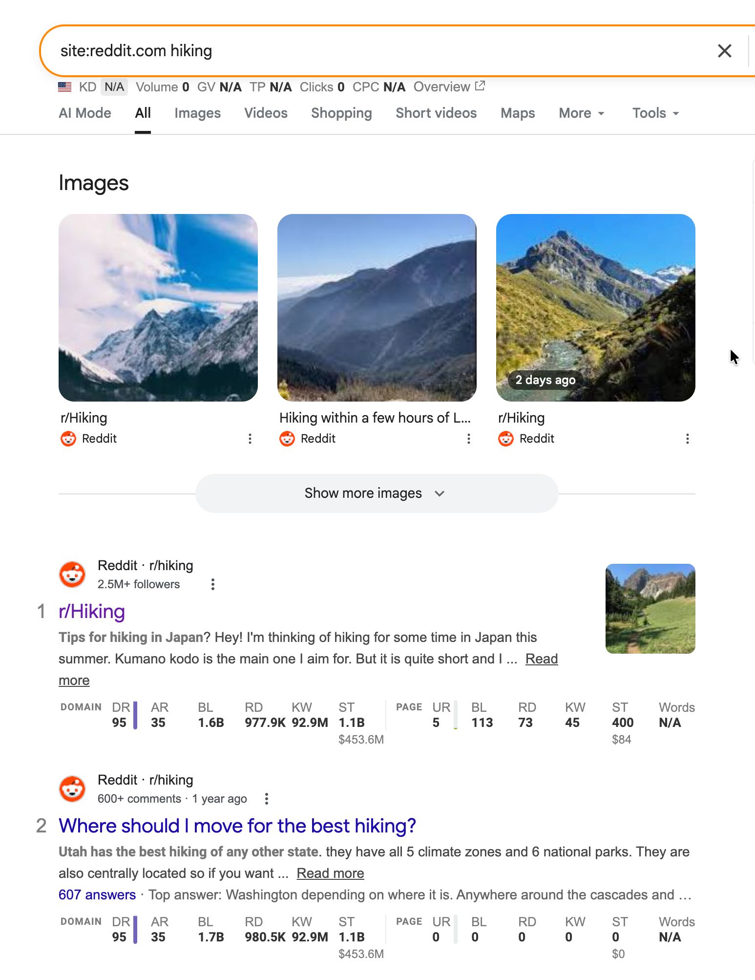 Enter reddit.com/r/hiking and you’ll see every keyword that subreddit’s discussions rank for in Google. This is the fastest way to find proven keyword opportunities—if Reddit already ranks, the keyword has traffic potential.